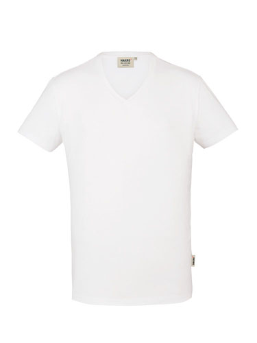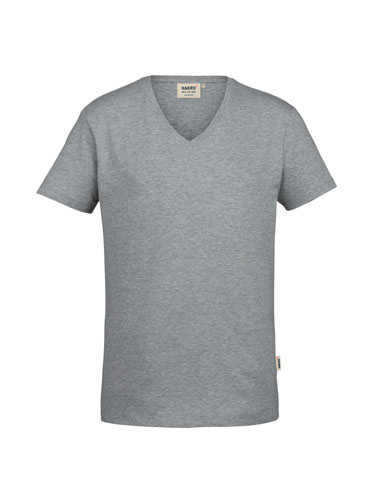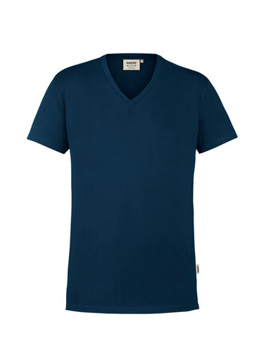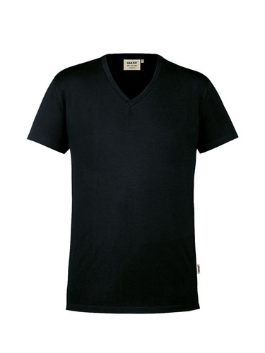 Körpernah geschnittenes T-Shirt mit modischem V-Ausschnitt mit schmalem Bündchen und Nackenband. Hergestellt aus feinem, mittelschwerem Single-Jersey aus langstapeliger, gekämmter und ringgesponnener Baumwolle mit LYCRA®. Gewebtes HAKRO-Necklabel aus hochwertigem Kettsatin mit weichen, ultraschallgeschnittenen Bandkanten für höchsten Tragekomfort und gewebtes HAKRO-Flaglabel an der linken Seitennaht.